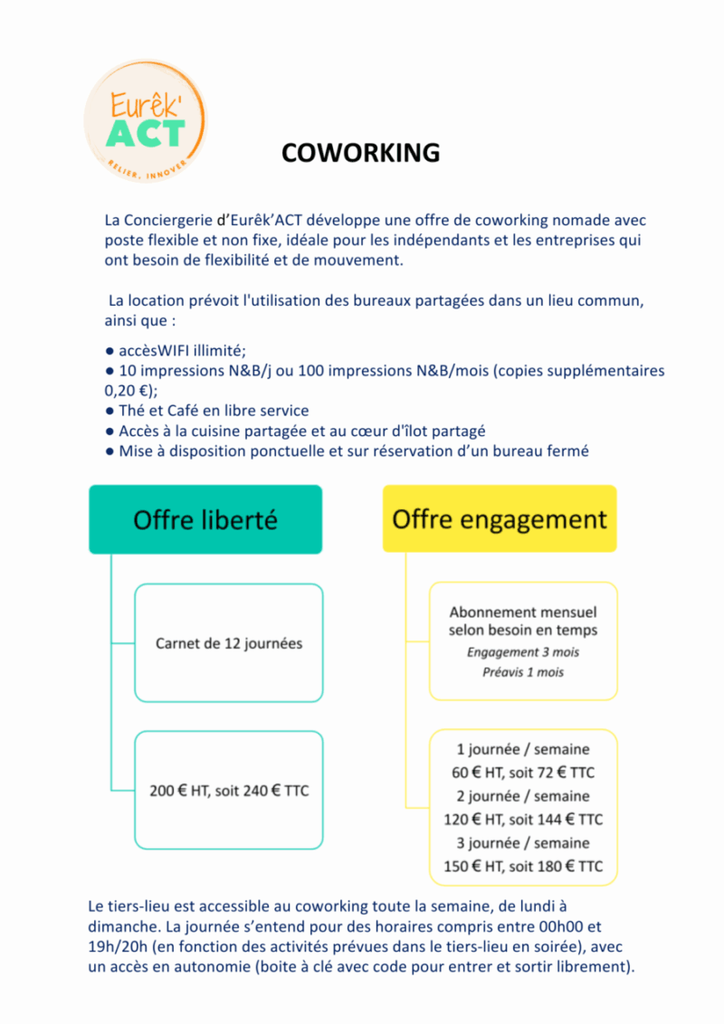 La Conciergerie d’Eurêk’ACT développe une offre de coworking nomade avec poste non fixe, idéale pour les indépendants et les entreprises qui ont besoin de flexibilité et de mouvement.