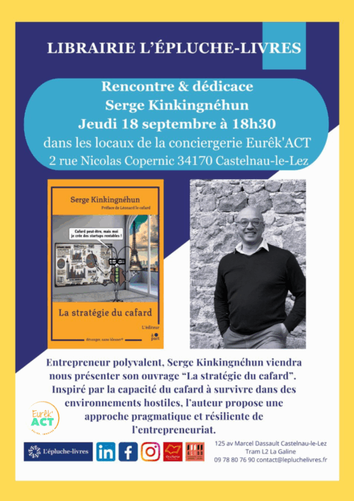 Rencontre dédicace avec Serge Kinkingnéhun Inspiré par la stratégie du cafard* à survivre en milieu hostile, Serge Kinkingnéhun propose une approche pragmatique et résiliente de l'entrepreneuriat. *Une startup cafard est une startup dont les fondateur·rices ne cèdent pas de pouvoir aux investisseur·es* Organisée par La Libraire L'épluche-livres. Jeudi 18 septembre, 18h30 A La Conciergerie d'Eurêk'ACT